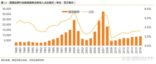 美国证券行业的融资融券业务收入整体跟随市场波动。1986年到1993年之间,融资融券业务收入平均在31.49亿美元,占比平均4.3%。从1994年开始,进入上升通道,并在2000年达到阶段性高点,当年融资融券业务收入242.74亿美元,占比7.3%。此后,2001年到2003年进入调整期,2001年仅为137.49亿元,同比下降43%。2004年开始进入新一轮的增长期,并在2007年收入规模创新高达到322.87亿美元,收入占比达到6.8%。从2008年开始,美国融资融券的收入急剧下降,到2010年该收入不到50亿元美元,不到2007年的20%。而进入20世纪第二个十年后, 该收入开始稳步提升,截至2016年融资融券的收入为88.64亿美元,占比3.3%,较2000年和2008年两个高点下滑超过50%以上。