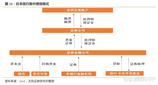 日本资本市场的证券借贷业务始于上个世纪50年代,从一开始就采用了转融通集中模式,在服务融资融券业务发展方面取得良好的效果。在日本资本市场,证券金融公司是整个融资融券业务的核心,严格控制着资金和证券通过信用交易的倍增效应。证券公司只能向交易所附近的证金公司申请借券,且证券商须是交易所正式会员,因此不同证金公司之间是独立关系。证券金融公司的上游主要是面对非银行金融机构、中央平准基金、银行、股东以及货币市场等,通过这些机构或个人筹集证券、资金等。证券金融公司下游面对的是证券公司,为证券公司提供资金、证券,并从证券公司处收取一定的抵押物与保证金,最终通过证券公司的方式向市场提供证券借贷及融资服务。