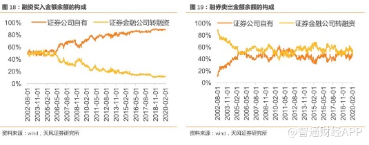 从融资融券的资金和证券来源来看,来自于证券金融公司的转融资和转融券的占比自2002年以后逐年下降,尤其是融资买入金额余额的结构上,现阶段证券公司自有的资金占比超过80%。上述现象的主要原因是证券公司的融资渠道逐步拓宽,外资银行主导的场外证券借贷业务规模提升,境外基金与大型资管机构直接与证券公司协议,绕开了证券金融公司。而担保品的再利用,扩大了证券公司本身的资金规模以及证券规模,对于证券金融公司的需求自然有所下降。