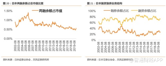 定量角度:1)美国两融余额占总市值比例平均为2-3%,融券余额占比在20%-30%之间。融资融券业务收入跟随市场变化,收入占比一般在3%-8%之间。2)日本两融余额占总市值比例平均为0.78%,基本在0.5%-2%之间波动,融券余额占比平均为27.9%。融资融券成交额占全市场成交额的比重平均为14%,两融净收入占日本证券行业净利润的比重平均为15%。