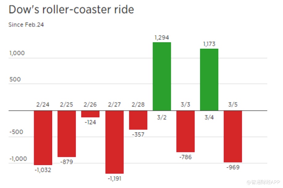 智通财经APP获悉,本周标普500指数经历了戏剧化的一周,连续四个交易日上涨/下跌超过2%。道琼斯工业平均指数本周两次跃至1000点以上,涨幅在截至周五却几乎被全部抹平。