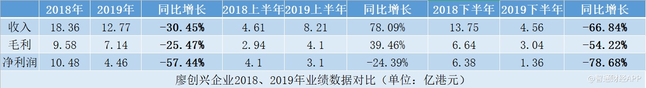 智通财经APP发现,廖创兴企业2019年下半年的收入为4.56亿港元,同比下滑66.84%,而在上半年时,其收入增速高达78.09%,增速落差巨大。
