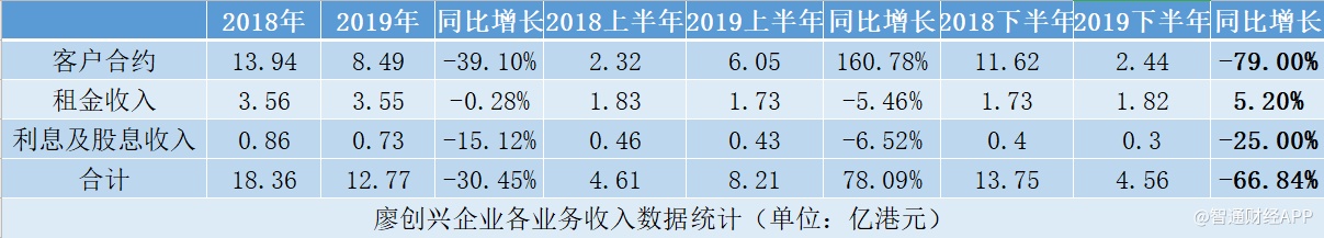 而客户合约收入大跌的背后,是物业发展收入的大幅下滑。据廖创兴企业数据显示,2019年时,公司出售佛山翠湖绿洲花园第四期的303套住宅单位而录得约7.42亿港元的销售收入。但其中的5.62亿港元是在上半年确认为收入,下半年物业发展的销售收入仅有1.8亿港元。