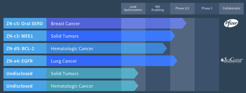 该公司的IP是从Recurium IP Holdings, LLC引进,在2014年12月签订协议获得10个目标靶点项目,包括ZN-c5,ZN- c3和ZN-e4等。