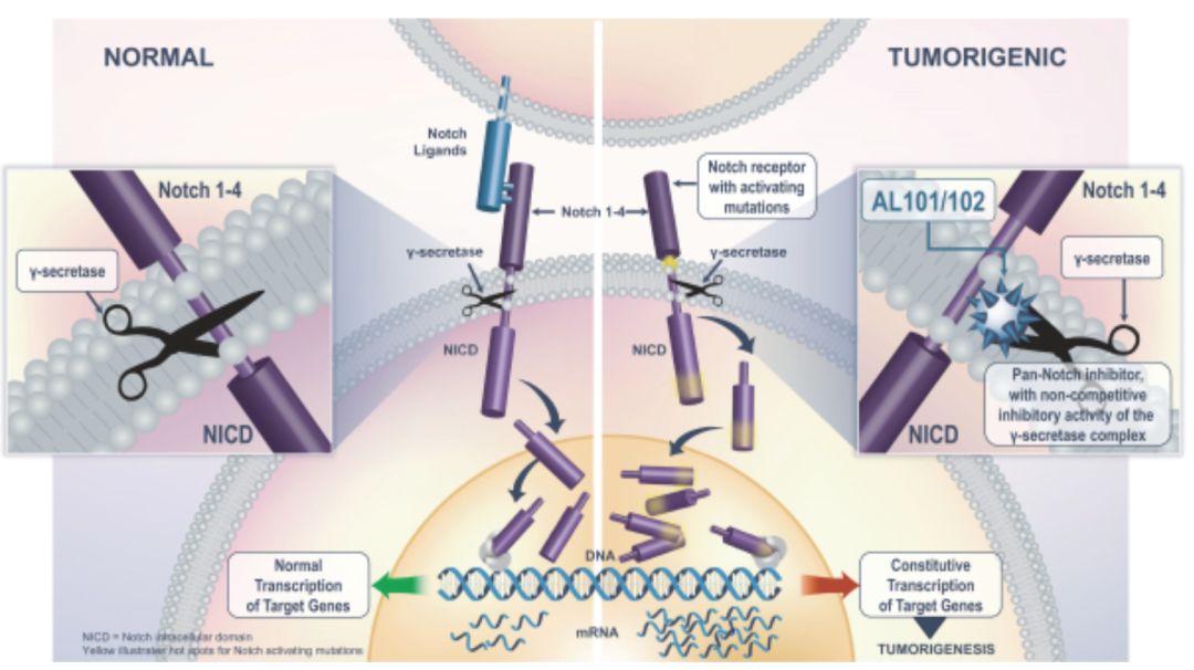 AL101是一种用于肿瘤适应症的Notch基因突变抑制剂,专门针对抑制γ分泌酶。Notch信号通路在多种实体和血液恶性肿瘤的肿瘤发生中起重要作用。在Notch受体的配体结合后,Notch受体活化的一个重要步骤是γ分泌酶的裂解,释放细胞内的Notch信号域。