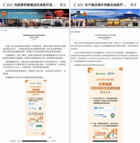 北京时间3月8日,阿里健康宣布,开通海外侨胞在线医疗咨询专区。同日,该专区被中国驻意大利大使馆和中国驻日本大使馆推荐使用。