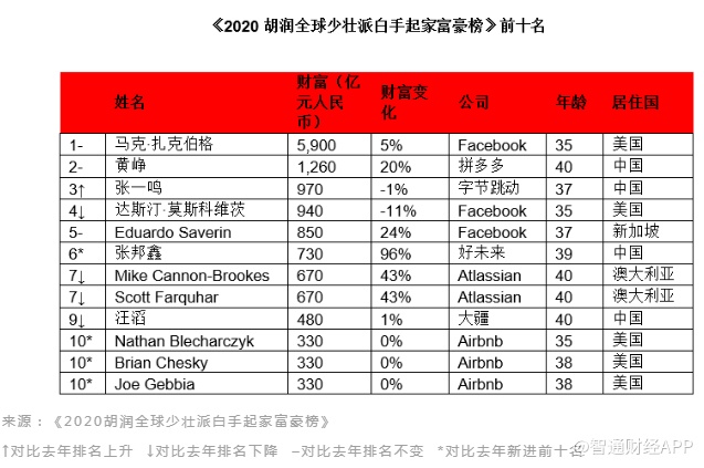 前十名中有四位新面孔。前十名门槛为330亿人民币,低于去年的440亿。35岁的马克·扎克伯格财富增长500亿人民币,以5900亿连续第五年成为全球80后白手起家首富。前三名中的两个中国人是:拼多多(PDD.US)40岁的黄峥(财富增长20%),以1260亿元排名第二;抖音创始人37岁的张一鸣以970亿元排名上升一位至第三。而课外辅导机构好未来(TAL.US)39岁的张邦鑫财富翻了一番,以730亿元排名上升五位至第六。