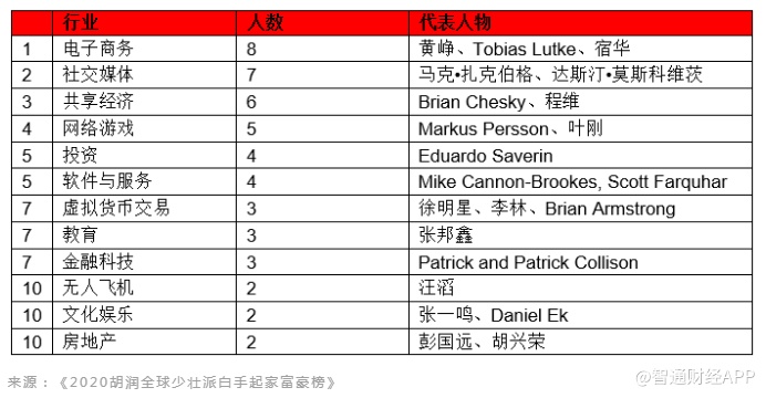 从行业分布看,电子商务和社交媒体创造了最多的80后十亿美金企业家,分别有8人和7人上榜;其次是共享经济和网络游戏。