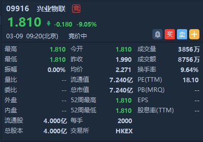 智通财经APP获悉,兴业物联(09916)首日挂牌,公告显示,公司发行1亿股,每股定价1.99港元,每手2000股,所得款项净额估计约为1.678亿港元。截至发稿,跌9.05%,报1.81港元,成交额8756.16万港元。