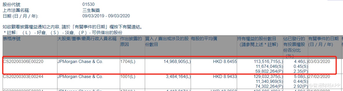 智通财经APP获悉,联交所最新资料显示,3月3日,摩根大通减持三生制药(01530)约1496.89万股,每股作价8.6455港元,涉及总金额约为1.29亿港元。减持后最新持股数目约为1.14亿股,最新持股比例4.46%。