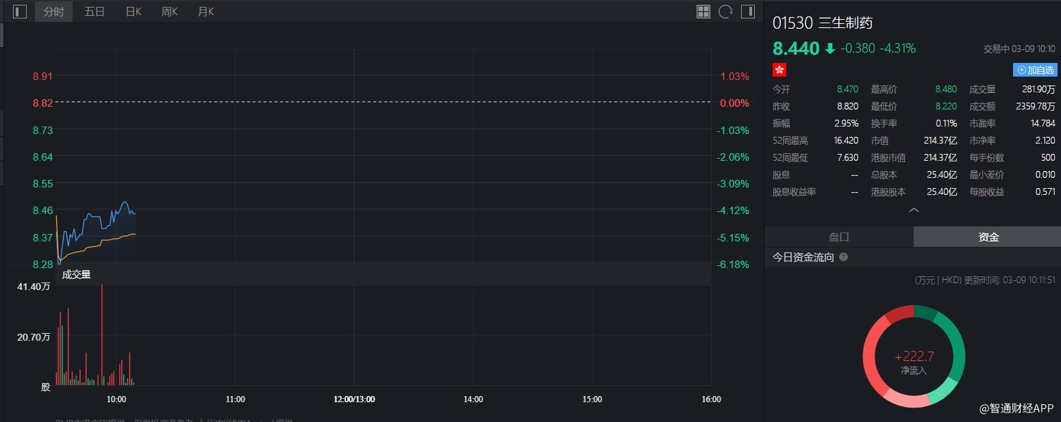 截至发稿,三生制药(01530)跌4.31%,报8.44港元。