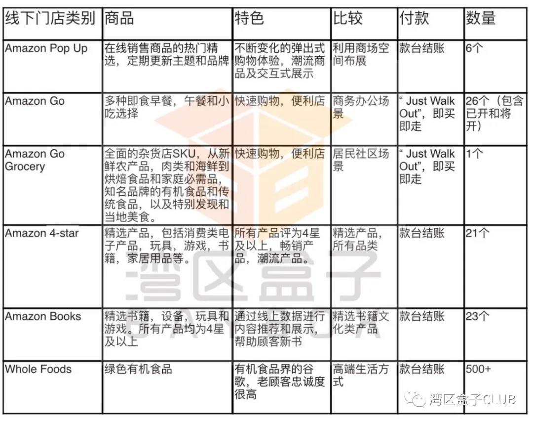 首先,我们来对比一下亚马逊通过线下六种业态分别想干些什么。