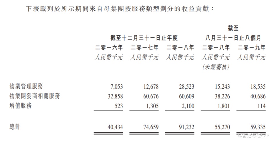 从收入构成看,烨星集团的业务划分为三部分,物业管理服务、物业开发商相关服务及增值服务,三项业务收入占稳定,2019年前8个月,来自物业管理服务的收入1.23亿元人民币(单位下同),占总收入69.9%,物业开发商相关服务、增值服务分别为4123.5万元、1153.2万元,分别占23.5%、6.6%。
