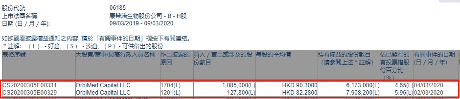 智通财经APP获悉,联交所最新资料显示,3月2日和4日,OrbiMed Capital LLC分别减持康希诺生物-B(06185)12.78万股及108.5万股,合计121.28万股,每股分别作价82.28港元及90.30港元,总金额约为1.08亿港元。减持后最新持股数目约为617.3万股,最新持股比例4.65%。