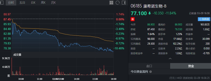截至今日收盘,康希诺生物-B跌11.84%,报77.10港元。