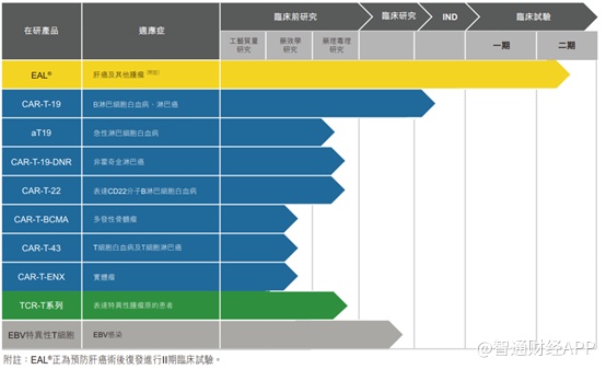 但这仍然掩盖不了市场规模小的现状。智通财经APP注意到,目前中国正在进行临床试验的11款细胞免疫治疗产品中,10款为CAR-T细胞产品,另外一款为AAL产品,也即EAL®所属类别。这两种产品针对不同类型的癌症有疗效,EAL®也是目前国内走在前列的相关产品。