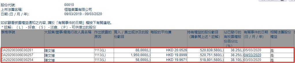 智通财经APP获悉,联交所最新资料显示,3月3日、4日和5日,执行董事陈文博分别增持恒隆集团(00010)5.8万股、195万股、8.8万股,合计209.6万股,每股分别作价为19.9671港元、19.8999港元及20.0526港元,总金额约为4201.19万港元,增持后持股数目约为5.21亿股,持股比例为38.25%。