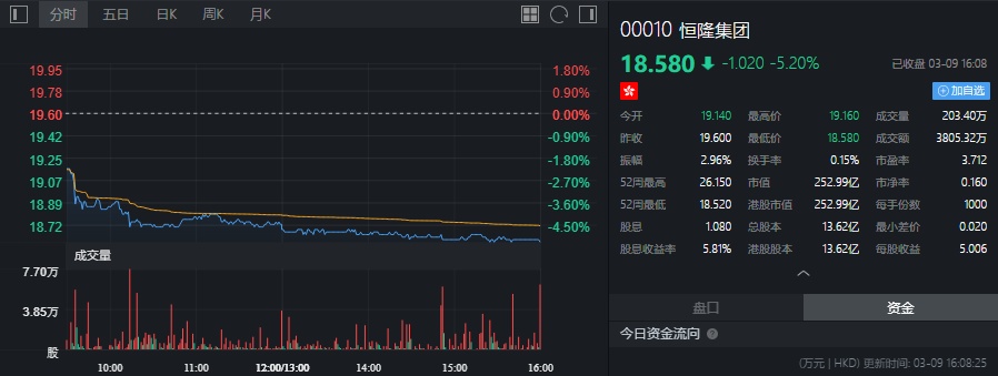 截至今日收盘,恒隆集团(00010)跌5.20%,报18.58港元。