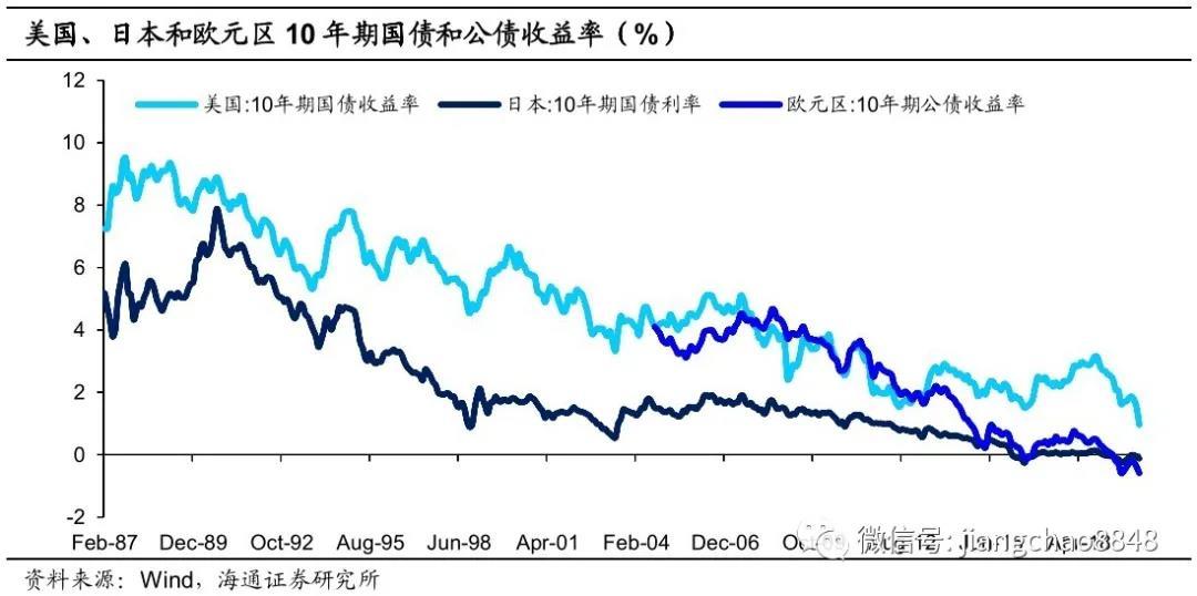 而从更长的期限来看,人口老龄化和技术进步缓慢导致目前全球处于低利率环境。目前大部分发达国家面临严重的老龄化问题,2018年日本15-64岁人口占总人口的比重仅为59.7%,相比于2000年下降8.5个百分点,而2018年欧元区15-64岁人口占比相比于2000年也下降了2.8个百分点。同时,信息技术革命以后,目前并没有出现能够大幅提高生产效率的新技术进步,这都导致经济增长缺乏内生动力。而面对经济的疲软,各国央行采取了宽松的货币政策进行刺激,导致大部分发达国家的利率都处于历史低位。其中日本和欧元区10年期债券收益率已经连续多月处于负值区间。而美国10年期国债收益率已经接近历史低点。