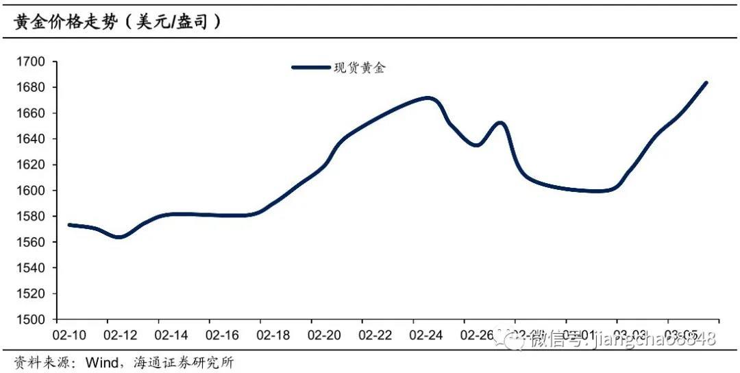 近期黄金价格出现明显上涨。2月12日以来国际黄金价格出现明显上涨,尽管2月25日出现小幅回调,但3月3日以来再次加速上涨,3月6日伦敦现货黄金价格已经达到1683美元/盎司,创下2012年10月以来的历史新高。