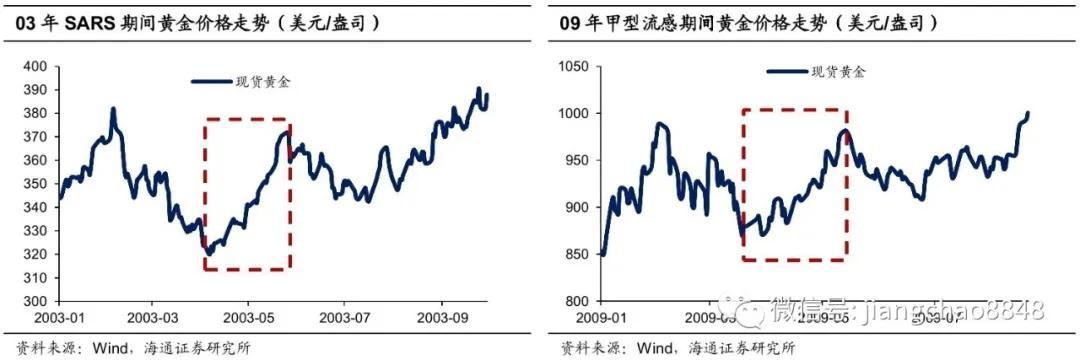 03年SARS和09年甲型流感爆发时期,黄金也出现过短期上涨。2002年底SARS在广东省开始爆发,但是真正引起公众的广泛关注则是在2003年4月以后。从当时的黄金价格走势来看,国际黄金价格从03年4月7日的319.9美元/盎司上涨到5月27日的371.4美元/盎司,累计涨幅达到16%,但随着事件逐步得到控制,黄金价格又出现小幅回落。而发生在2009年的甲型H1N1流感首先是在墨西哥爆发,随后扩散到美国等全球200多个国家和地区。09年4月25日世界卫生组织(WHO)将其宣布为国际公共卫生紧急事件(PHEIC),当时黄金价格从09年4月17日的870.5美元/盎司上涨到6月10日的981.8美元/盎司,累计涨幅近13%。随后尽管流感病毒还在肆虐,但金价仍在情绪面修复后出现回落。此外,过去十几年世界卫生组织还宣布过多次PHEIC,包括埃博拉病毒、寨卡病毒等,但是因为并没有在主要经济体内传播,所以对金价影响并不大。