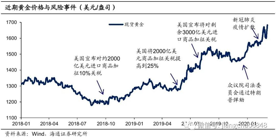 18年以来黄金价格上涨与中美贸易磋商进展密切相关。黄金价格自18年9月开始持续上涨,这一时点对应的是美国宣布对约2000亿美元的中国商品加征10%的关税,反映了贸易关系的升级。而19年初黄金价格停止上涨并进入调整阶段,对应的是18年12月中美达成暂停协议后的阶段性缓和。随着19年5月和8月美国再次宣布提高2000亿美元中国商品关税税率和对剩余3000亿美元中国商品全面征税,黄金价格从5月开始开启新的一轮上涨。随着19年10月中美初步达成第一阶段协议,黄金价格又进入短期调整。