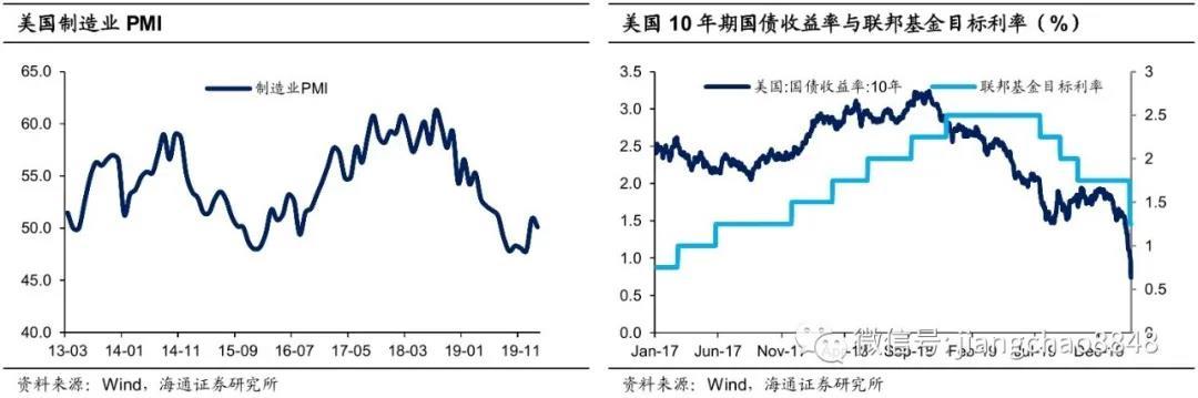 而金价之所以能持续上涨也是因为贸易问题确实带来了美国经济的下行压力,货币宽松也进一步刺激了黄金的保值需求。受到18年美联储多次加息和贸易问题升温的影响,美国经济从18年下半年开始就持续回落,制造业PMI在19年8月以后一直处于荣枯线以下。受到美国经济走弱预期的影响,美国国债收益率在美联储还在加息时就出现持续下行。随后美联储在18年12月结束加息,并在19年8月启动降息。美联储货币政策的转向带动美国实际利率进一步下行,于19年8月一度跌入负值,而这也进一步刺激了黄金的保值需求,使得金价得以维持高位。