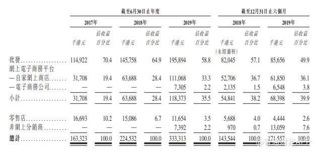 招股书显示,截至2017年、2018年及2019年6月30日止三个年度及截至2019年12月31日止六个月来自批发客户所产生的收益分别占该公司总收益约70.4%、64.9%、58.8%及49.9%。截至最后实际可行日期,该公司也通过零售店(包括两间Canmake自租店、一间Bou Eki自租店、一个Canmake专柜及一个Bou Eki专柜)直接向香港的消费者出售其产品。