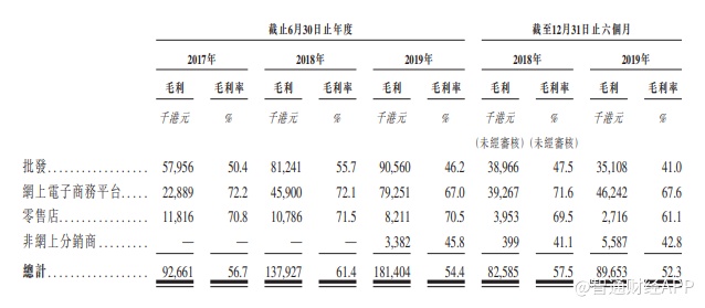 其中,批发渠道毛利率由截至2018年12月31日止六个月的约47.5%下降至截至2019年12月31日止六个月的约 41.0%。这主要由于公司向五大客户其中两名提供具竞争力的价格以增加销售订单。