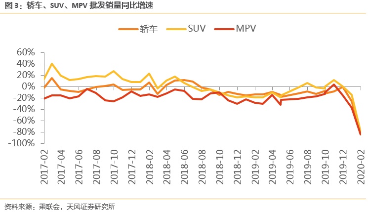 轿车、SUV、MPV销量大幅下降。2月轿车、SUV、MPV批发销量分别为9.3万辆、11.1万辆和1.4万辆,轿车批发销量同比下降84.1%,SUV批发同比下降79.4%,MPV同比下降84.0%。