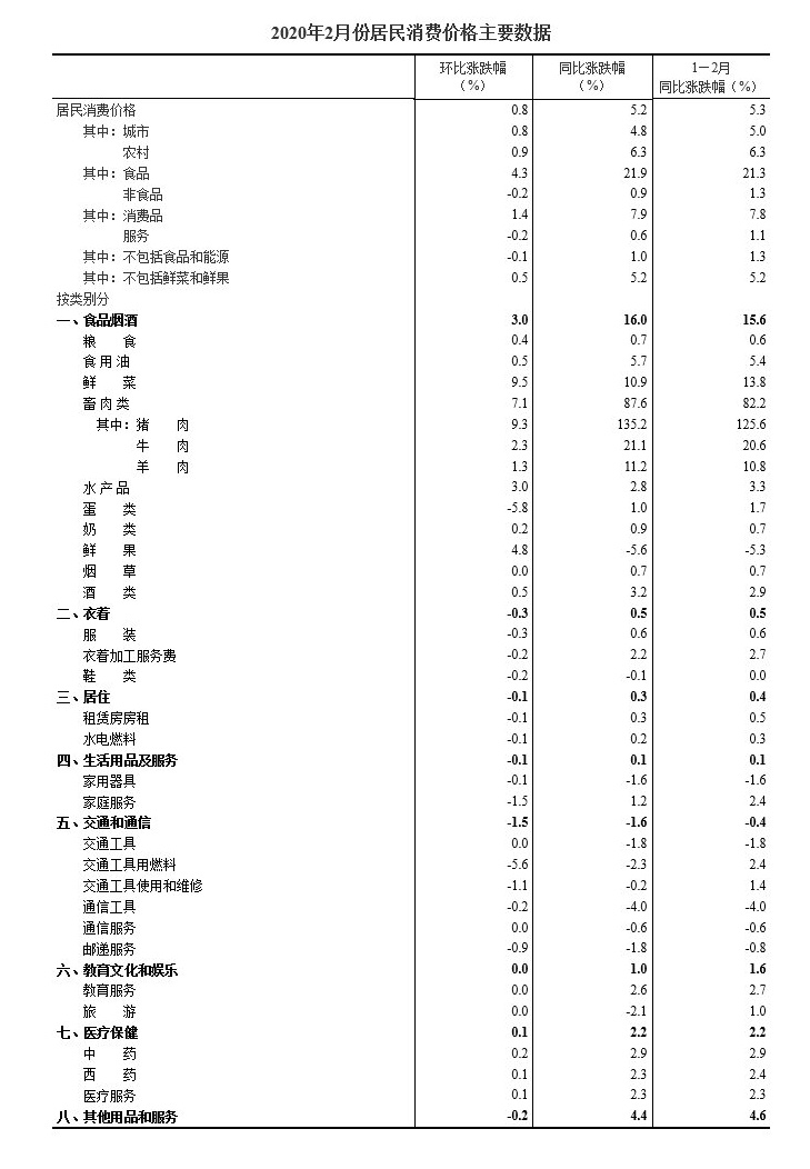 智通财经APP获悉,统计局今日公布,2020年2月份,全国居民消费价格(CPI)同比上涨5.2%。其中,城市上涨4.8%,农村上涨6.3%;食品价格上涨21.9%,非食品价格上涨0.9%;消费品价格上涨7.9%,服务价格上涨0.6%。1—2月平均,全国居民消费价格比去年同期上涨5.3%。