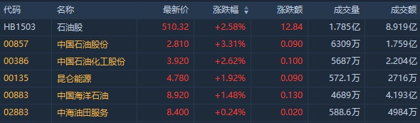 智通财经APP获悉,市场人士认为,油价暴跌宣泄之后,下行空间已有限。今日国际油价小幅上扬,港股石油股集体反弹。截至发稿,中石油(00857)涨3.68%,报2.82港元;中石化(00386)涨2.62%,报3.92港元;中海油(00883)涨1.59%,报8.93港元。