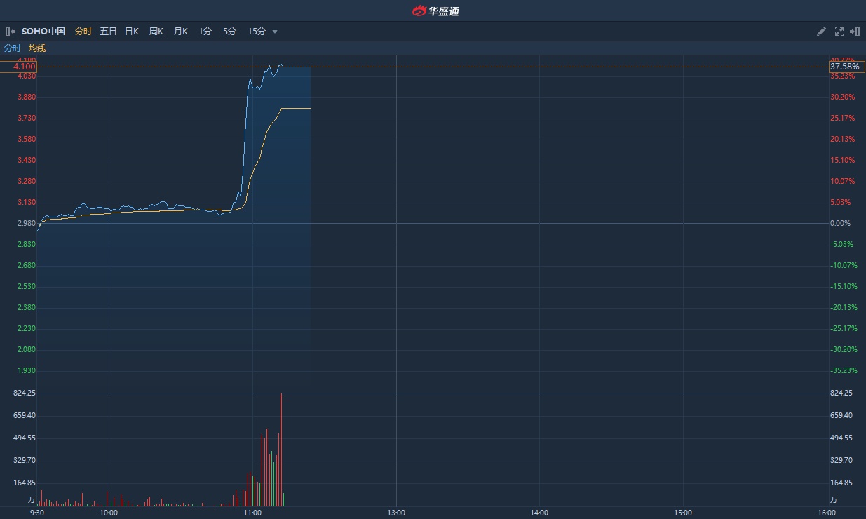 智通财经APP获悉,据媒体报道称,黑石集团(BX.US)正与SOHO中国(00410)就后者私有化进行谈判,黑石集团提出的报价为每股6港元,交易价值40亿美元。预计交易事宜将在未来数周内宣布。SOHO中国盘中飙涨近40%后临时停牌。截至停牌前,涨37.58%,报4.1港元,成交额2.98亿港元。