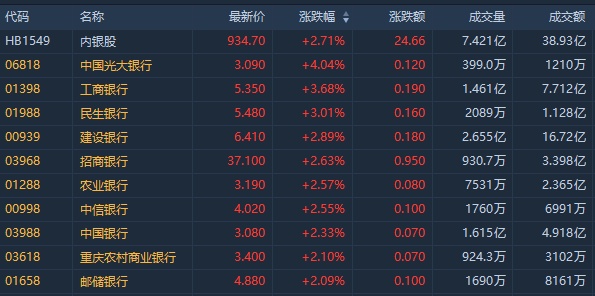 截至发稿,中国光大银行(06818)涨4.04%,报3.09港元;工商银行(01398)涨3.68%,报5.35港元;建设银行(01398)涨3.05%,报6.42港元;招商银行(03968)涨2.77%,报37.15港元。