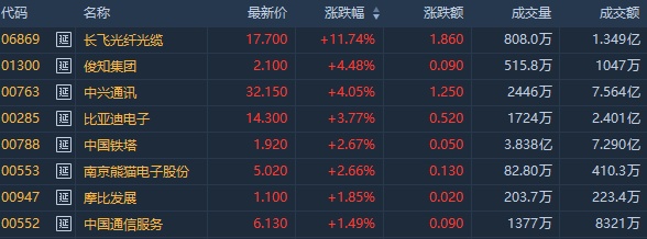 截至发稿,长飞光纤电缆(06869)涨10.48%,报17.5港元;俊知集团(01300)涨4.98%,报2.11港元;中兴通讯(00763)涨3.56%,报32港元;中国铁塔(00788)涨3.21%,报1.93港元。