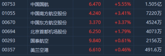 智通财经APP获悉,大和指,油价下跌叠加政策利好航空板块将受惠。航空板块盘中全线反弹,午后涨幅再度扩大,截至14时00分,中国国航(00753)涨5.55%,报价6.47港元,南航(01055)涨3.41%,东航(00670)涨3.37%。