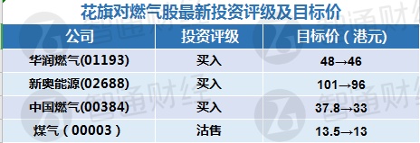 花旗同时下调对中资燃气股目标价,其中华润燃气目标价由48元降至46元;新奥能源目标价由101元降至96元;中国燃气目标价由37.8元降至33元,不过评级均为“买入”。花旗还下调对煤气(00003) 的目标价,由13.5元降至13元,评级“沽售”。