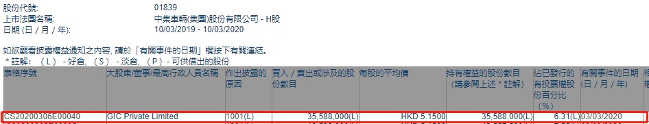 智通财经APP获悉,联交所最新资料显示,3月3日,GIC Private Limited增持中集车辆(01839)3558.8万股,每股作价5.15港元,总金额约为1.83亿港元,增持后持股数目约为3558.8万股,持股比例为6.31%。