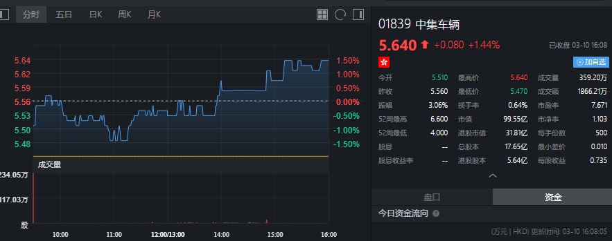 截至今日收盘,中集车辆涨1.44%,报5.64港元。