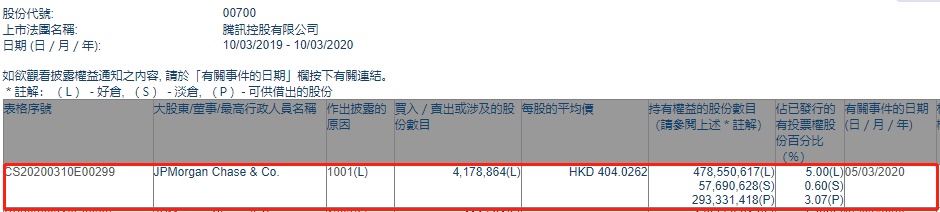 智通财经APP获悉,联交所最新资料显示,3月5日,摩根大通增持腾讯(00700)417.8864万股,每股作价404.0262港元,总金额约为16.88亿港元,增持后持股数目约为4.79亿股,持股比例为5%。