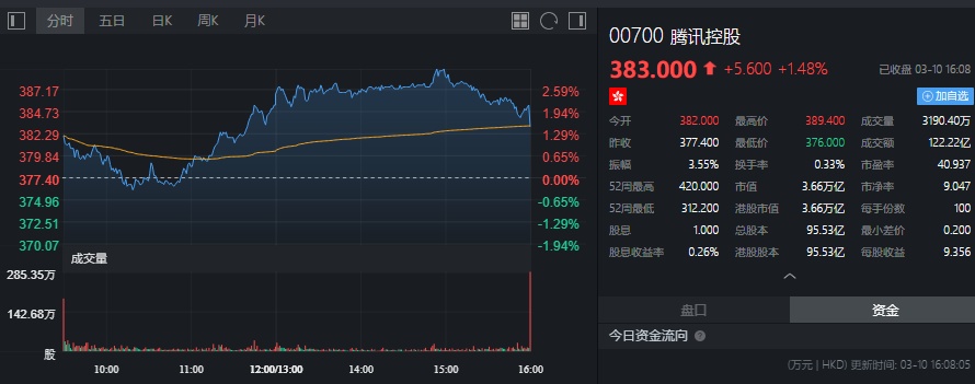 截至今日收盘,腾讯涨1.48%,报383港元。