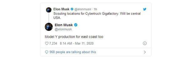 马斯克写道:“正为Cybertruck超级工厂选址。将在美国中部。Model Y生产将在东海岸。”