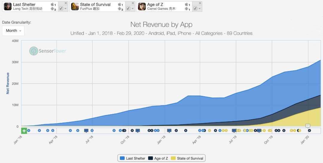 三款游戏的海外总收入,较去年同期增长182.6%。在市场布局方面,龙创悦动《守望黎明》和壳木软件《Age of Z》主打美日韩三个市场,FunPlus《State of Survival》则主打欧美市场。