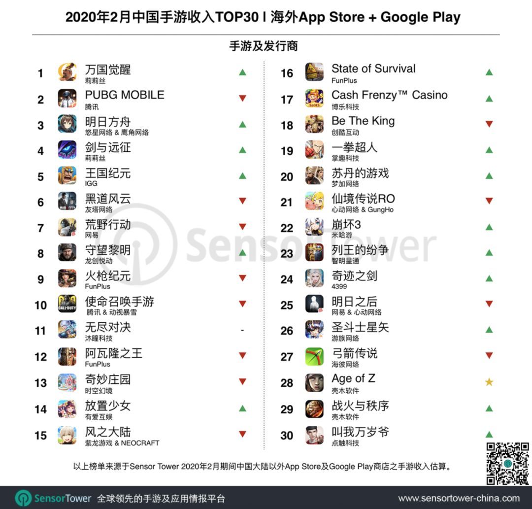 Sensor Tower 商店情报平台最新数据显示,2020年2月期间中国手游产品在海外市场收入排名TOP30,详细榜单变化如下。