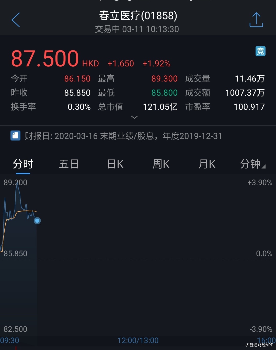 截至发稿,春立医疗涨1.93%,报87.5港元。