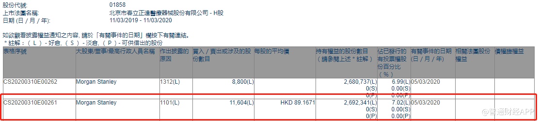 智通财经APP获悉,联交所最新资料显示,3月5日,摩根士丹利增持春立医疗(01858)1.16万股,每股作价89.1671港元,总金额约为103.43万港元,增持后持股数目约为169.23万股,持股比例为7.02%。