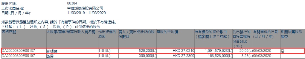 智通财经APP获悉,根据联交所资料显示,中国燃气(00384)执行主席兼总裁刘明辉于3月9日增持中国燃气52.62万股,每股作价27.021港元,总值约1421.85万港元。增持后最新持股数目约10.92亿股,最新持股比例为20.92%。