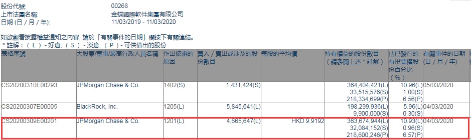 智通财经APP获悉,联交所最新资料显示,3月4日,摩根大通减持金蝶国际约(00268)466.56万股,每股作价9.9192港元,涉及总金额约为4627.95万港元。减持后最新持股数目约为3.64亿股,最新持股比例为10.93%。