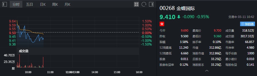 截至发稿,金蝶国际(00268)跌0.95%,报9.41港元。