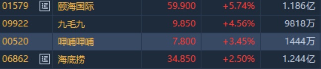 智通财经APP获悉,餐饮板块连续反弹,重获资金追捧,颐海国际(01579)涨近6%,高见60.1港元创新高,暂领涨板块。截至11时52分,颐海国际涨5.74%,报价59.9港元,九毛九(09922)涨4.56%,报9.85港元。呷哺呷哺(00520)涨3.45%,海底捞(06862)涨2.5%。